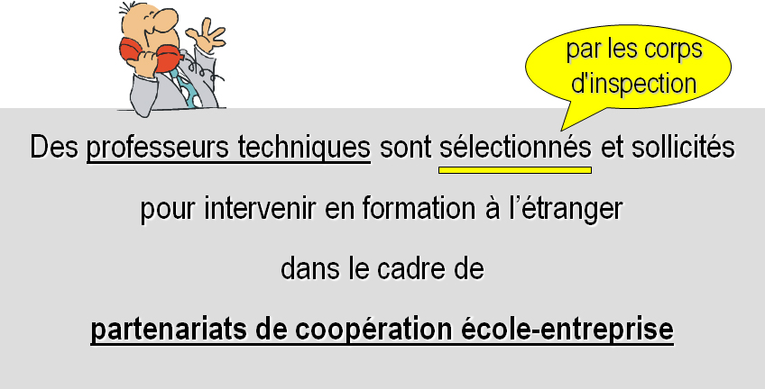 Tous les frais sont supportés par l’entreprise partenaire : avion, transferts, visas… hébergement et pension complète, interprète si nécessaire… rémunération des professeurs (via un GIP).